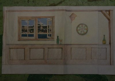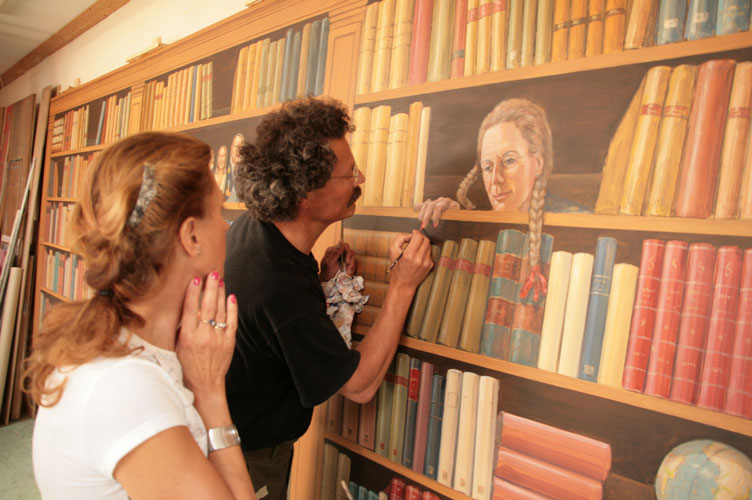 Voor de nieuwe woning van een opdrachtgever in Bussum heb ik deze boekenkast (600 x 200 cm ) geschilderd. De schildering wordt geplaatst op de eerste etage en is vanuit de woonkamer te bekijken. In de muurschildering zijn een aantal grapjes verwerkt. De vrouw des huizes kijkt vanuit de boekenkast naar beneden. Het vliegtuig en de wereldbol vertegenwoordigen het beroep van mevrouw, namelijk purser bij de KLM. De matroesjka’s (Russische poppetjes) laten de complete familie zien.