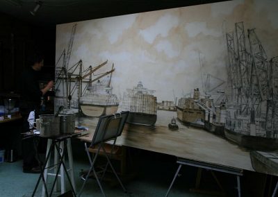 Voor een particulier een groot schilderij (300×200 cm) van een 17e eeuwse plattegrond van Amsterdam gemaakt. Om de kaart heen zijn belangrijke gebouwen in sepiatinten geschilderd. O.a. het Rijksmuseum, Scheepvaartmuseum, Paleis op de Dam en Café Hoppe. Omdat het schilderij niet door het trapgat paste en takelen geen optie was, is het schilderij uit elkaar gehaald en in het grachtenpand opnieuw in elkaar gezet.