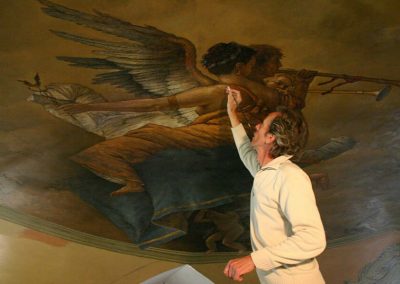 In een kerk te Schipluiden heb ik samen met Ruud Krijnen, een plafondschildering (200 m2) gemaakt in renaissance stijl gemaakt. Een prima samenwerking, waarbij ik vooral vanwege mijn trompe l’oeil kunsten (voorstellingen die het oog bedriegen) een belangrijk aandeel kon leveren. De bedoeling: een complete illusie creëren wanneer je omhoog kijkt.