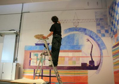 Voor het nieuwe gebouw van de TU Delft, heb ik in de aula van de verdieping “Geo-Engeneering” grote wandschilderingen (7m x 4,5m / 13m x 1,5m) gemaakt. De beschilderingen moesten raakvlakken hebben met de afdeling (grondonderzoek). Lastig, want waar is zo’n afdeling dan precies mee bezig? Door veel te praten met de mensen, kwam ik daar achter. Uiteindelijk heb ik door middel van gekleurde aardlagen, tunnels en gebouwen geprobeerd de juiste sfeer te zetten. De muurschildering was op tijd af voor de feestelijke opening van het gebouw waarbij minister Plasterk aanwezig was.